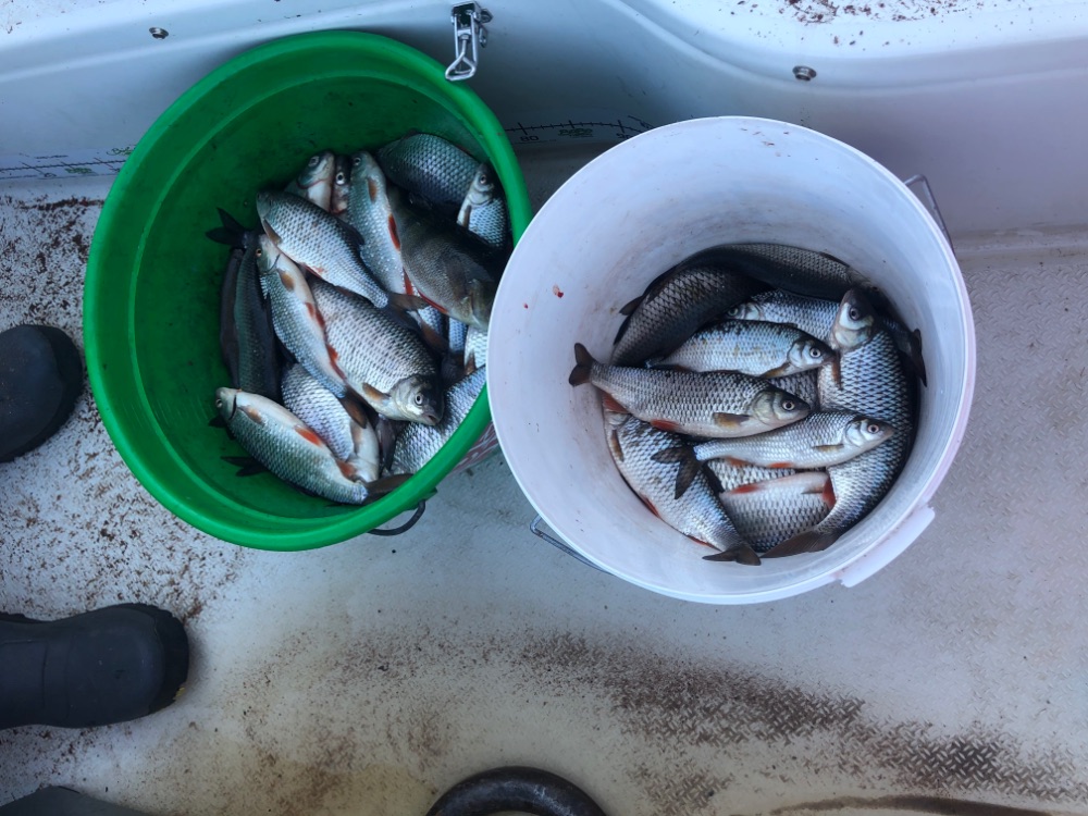 Заякорились на свале, закормились, плотва себя сразу проявила и исправно клевала часов до 10-11. Далее уже хуже, как-то набегами - то 3 подряд, то в час по чайной ложке....но клёв в общем то был весь день. К обеду на воде был аншлаг ;) Товарищ взял пару вимб, ну и взяли по хорошему окуню. Плотва разная, но в восновном крупная. В 16 отчалили до дому.