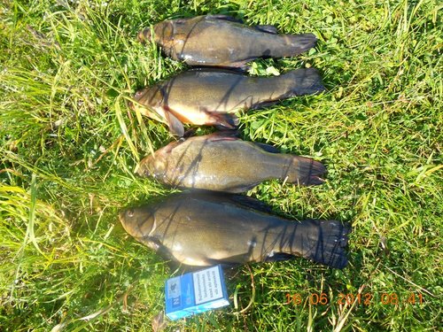 Утром не проспал.Подъехав к озеру,определился:на всё про всё у меня ровно три часа.Из плюсов:погода штиль,место изучено.Из минусов:время ограниченнно.Около кило сухого корма,быстро замес-шары-закорм;оставил чутка,на всякий случай.Заброс,идеально оснастка покажет глубину,каждый сантим,взависимости ближе-дальше,плавный свал.Потянулось ожидание,поглядывая на часы,тока подумал,запаздывает первая поклёвка.Тока подумал и вот она.И была лещёвая,наверно тута от снасти:поплавок заваливается-заваливается-лёг,развернулся на сто восемдесят градов и поплыл .Чуть обождав подсечка,и началось:трух-плюх-бум,с задеваниями камыша,на всякий случай фрикцион чуть-чуть ослабил перед рыбалкой,не срабатывает,увереноо волоку к берегу,и вот уж голова на берегу,сам ещё в воде,но видно сдаётся,а мне дальше ни как,уда начинает цеплять ветви деревов,отходить опуская удочку-не в коем разе.Держу поднятую,и всовыаю второе колено в первое(от основания),номер вышел,и линь на берегу.Была какая-то внутренняя уверенность.Проходит почти час-ни поклёвки,тишь да гладь,перепробовано из наживок усё,пускаю в ход остки прикорма,и долго не заставила ждать себя очередная поклёвка:всё повторилось точь в точь.Решаю сократить рыбалку ещё на 15минуток,и заскочить домой,отвезти рыбку.Третьей поклёвки так и не дождался,хотя казалось подошёл линь,но небыло время.Настроение отличное,конечно,это не те динозавры,что издевались на до мной три рыбалки,но тож ничего.Околокилошные один чуть более,другой чуть менее.Главное поверил в снасть.И клюёт и ловится,больше мне ничего не надо было.