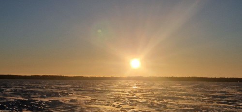 В общей сложности забрал с собой голов под 60, потянуло 8 кг. В три часа последний взгляд на Солнце и потопали на берег. Да, лёд уже около 500 мм.