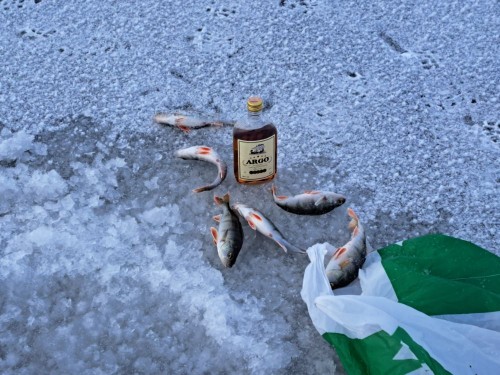 Вчера был один, рыбаков с прошлыми разами поубавилось сильно. Чуть сменил дислокацию вышел на прошлогодние точки. Вооружившись секушкой, балонсиром и балдой, попробовать решил половить окуня железом. Походил, походил с секушкой ни тычка. Минус девять, но без ветра, комфортные чем нуль с ветром. Развёл прикормочки, закормил несколько лунок, и достал мармышку. И дело потихоньку пошло. В основном средняя плотвичка, мелочишки тоже многовато проскакивало, но радовали окушки в прилове,на жарёху за глаза с достатком,ну и плотвичка посолить в аккурат. В общей сложности около восьми кило взял. Однако опять удовлетворение на все сто не получено, несмотря на отличный ход и хорошую погоду, какой-то осадочек остаётся, как будто что-то не так делаю. Остаётся только опять на сильное падение давления списать, да ночью опять уже метель. Не списывать же на кривые руки