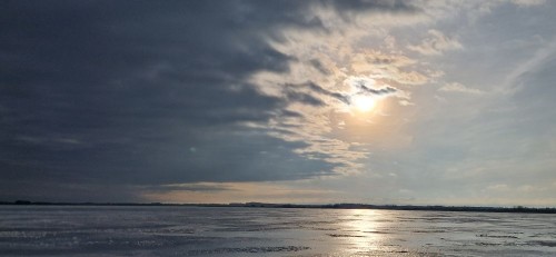 Очередной визит на озеро вчера, вода на льду схватилась ледяной корочкой, трещала и гнулась, но держала. В итоге ход хороший, немного скользко, т.к. встроенные шипы в подошву всёже хуже специальных съёмных "царапок". Морозец около -3, ветер южный около 8 м/с, позже усилился до 10 и погнал позёмку, после полудня стал стихать, а как идти на берег, почти успокоился.
