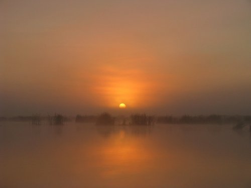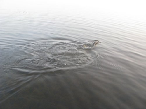 Самая необычная рыбалка сегодня у меня получилась с утра на этом озере, да и пожалуй за всю историю ловли на нем. Прибыл с темнотой, гладь да штиль, до солнца более менее поклевывало с часик, а как вылезло светило - обрубило. Рифма такая. Почапал окунька искать на полянки, а все полянки сегодня оккупировали стаи краснопера, шаряцца волнами и показалось мне что вроде как и охотяцца, бо иногда кээк вскипит стайка, потом другая, а на нерест не похоже. Пригляделся, а малька до опы . Лана, поставил самую махонькую вертуху и тут началось, от 200 до полукилограмма, не на заброс конечно, но часто били, иногда и на заброс даже, вот пожалел что камеры нет как у Кости, красотища, заброс, метр протяга, слева справа волны-зигзаги к блесенке, проводы с метр, потом кто то не выдерживает и тут вся шобла кидаецца на блесну, бах-тырсть-дерг, повисла... Стайка немного смещается, пока вываживаешь, тихонько к ней и по новой. Близко нельзя было подходить, вода кристалл, глубины от 0 до 30 см, все на пределе, а снасти на щукаса, но справлялся кое как .Так интересно было ловить что потерялся в континнуме и про--ал время работы, ну да и чорт с ней сегодня, позже может снова поеду, с наноприблудами . Сопротивляется достойно, клюеть бойко ну и конечно вся отпускается, куда её летом...
