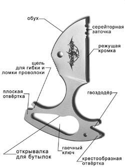 В рукоятке оригинально размещены плоская и крестообразная отвертки, щель для гибки и ломки проволоки, гвоздодер, гаечный ключ и открывалка для бутылок.