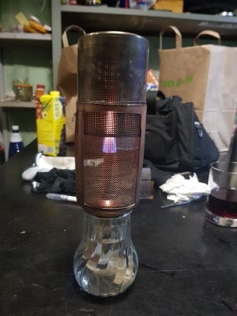 Во первых у меня не только сетка из нержавейки есть, но и завалялся нержавеющий контейнер для заварки чая от разбитого стеклянного заварника, методом проб и обожжёных пальцев, приблизительно выбрал высоту дожигателя-теплообменника. Мне эффект лампы Деви ни к чему, но сетка пропускает воздух, охлаждается и защищает механически от контакта с пламенем, думается, что и лучше прогорает спитрт с меньшими выделениями (могу ошибаться) у контейнера для чая обрезал юбочку и он совпал по диаметру с внутренним вкладышем от 700, возможно 500 милилитрового термоса, который мне случайно подогнали, из него я вырезал каркас для сетки и подрезав горлышко ему он удачно сел на крышку сахарницы упершись в её нижний выступающий край. Теперь надо как-то все собрать до кучи, где-то у меня завалялся самопальный точечный сварочник который я собрал в прошлом году на всякий случай, надо найти.