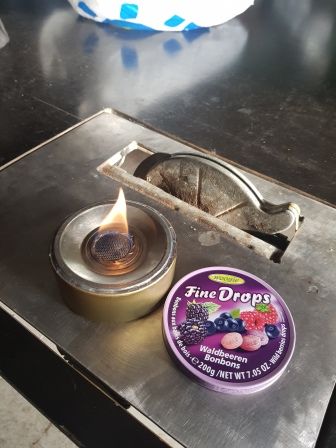 На той неделе, мне случайно на глаза попалась баночка из под леденцов в гараже, держал под форму для гипса отливать свинец. В голове уже летала мысль увеличить размер факела и я сразу подумал смастерить горелку типа топливного контейнера для биокамина. Нашлась и крышка от жестяного контейнера для "Русского Стандарта", удобный контейнер для разовых вилок и рюмочек. Придётся новую покупать...