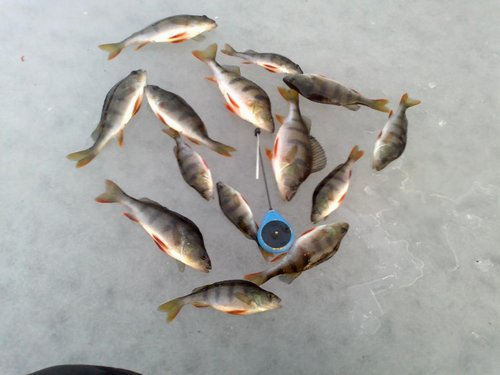 И всё-таки по настоящему зимний,я считаю сегодня первый день.Мороз и солнце,и снежок,синички синикают,красота.Пошол с буром прогуляться по утру,не усидел,и не зря;тропинка пересеклась с такими мэтрами по ловле окуня как: