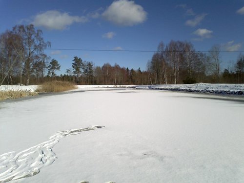 Сегодня встав по обыкновению рано,увидел за окном наичистейшее предрассветное утро и ни ветерка.Градусник показал -10.А ведь уже на завтра стращали до плюс тринадцати.То есть,тут уж к бабке не ходи :это мой последний шанс.Кофе,неспешные и не хитрые сборы,солнышко уже встало над горизонтом-13,прокачусь до Паункюла,посмотрю что к чему.Два человека уже сидело на льду.Но как то очень близко у берега.Я же окрылённый крепостью и толщиной вчерашнего льда на речушке,чуть не улетел с разгону на середину канала.Внутренний голос сам озвучил фразу:Доброе утро,как лёд? ответ показался довольно странным:Двоих держит,чуть подале трещит.Я ещё шёл по инерции,но в скорости явно сдал.Внимтельнее вглядевшись под снег,который покрывал лёд,смог угадать очертания,старого,шершавого льда,и уже нового,абсолютно гладкого и чёрного.Решаю первую лунку засверлить на стыке этих двух льдов,два оборота и усё,пусто,бур проваливается,не дыша и не шевелясь вытаскиваю,и плавненько, плавненько,задним ходом,метров десять.Бурю две лунки,лёд около 7-10см.Щупаю вроде нормальной структуры,однако даже при плавном передвижении,вода в лунках колышится и хочет расплескаться.Сверлю ещё несколько лунок неподалёку,в округе.Тут уж и дураку ясно,лёд не везде одинаков,и местами его практически нет:как нет его и на большом водохранилище.Когда парковал машину было видно,за большими островами открытая вода,да и с этой стороны подале слева промоина большая.Так что особенно не походишь,посмотрим что здесь водится.После закорма,весело и со всех лунок плотвички,не большие,мягко будет сказано,однако весело и уверенно.Поначалу отпускал,но обойдя все не особо из богатого выбора места,куда не побоялся ступнуть,понял выбирать будет не из чего.Очень хотелось жареной рыбки,бывает.Насобирал стока,скока прикинув смогу почистить,поблагодарил водяного,попрощался,и отправился в сторону дома. Уезжая дал круг почёта вдоль водохрона,приметил ещё двоих счастливчиков,нашедших островки,то ли нащупавших их,эти островки с ещё твёрдой водой,совершенно в разных концах водохранилища.Вот пожалуй и всё.Всем удачи
