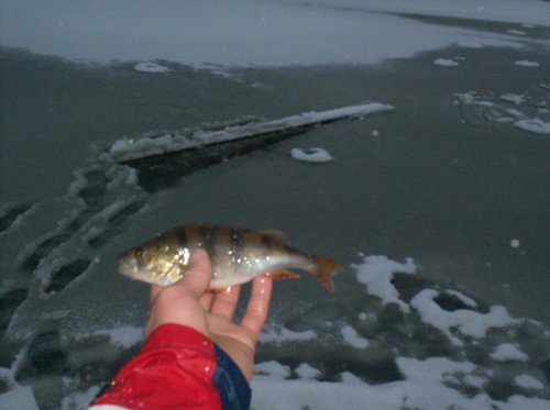 Проверили речку,на течении открыто,на ямках открыта середина.Зашли на самую большую,лёд 5 см.Пяток окушков на балансир и щучка сошла.