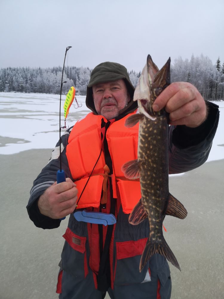 В таких небольших озёрах водятся только окунь и мелкая щука,в основном до 1,5 кг. Работал в Савонлинна какое то время и ловил на озёрах только мелочь,даже летом. Рядом есть большая вода,ели лёд будет то лучше туда.