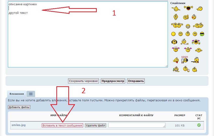 Теперь переходим обратно к тексту вашего сообщения и после строки текста за которой должна следовать картинка нажимаем "Enter", чтобы образовалась пустая строка. В начало этой новой строки ставим курсор и спускаемся вниз, туда где видны закачанные вами файлы. Под картинкой которую вы хотите вставить нажимаем кнопку "Вставить в текст сообщения". Повторяем эту процедуру несколько раз, если вы вставляете несколько картинок.