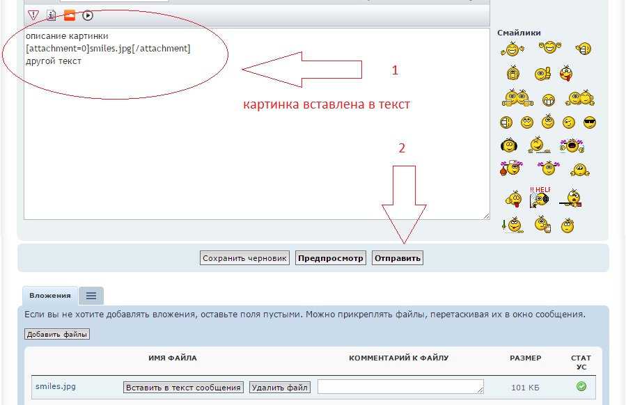 Если хочется внести изменения и переместить расположение картинки в тексте, просто целиком выберит строку с картинкой и перенесите ее в другое место. Если вы случайно поломали BBC код картинки в тексте, сотрите его и нажмите внизу "Вставить в текст сообщения" под нужным файлом еще раз