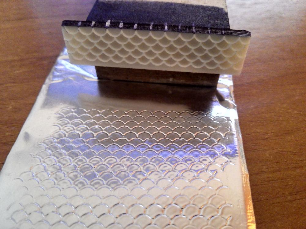 он изготовлен точно не скажу, материал листовой 3мм пластик хрупкий на излом, пользоваться просто .Я беру скотч алюмини. отрезаю сколько надо по длине воблера и кладу на ровное место.И ставлю штамп начиная от края скотча нажимая на него ,потом по рискам на штампе переставляю его совместив рисунок и надавливаю вновь ... так по всей длине. :sad: