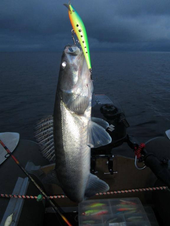 Клюёт на верховые модели с заглублением 1-2 метра и в основном на коротком отпуске от лодки (до 30 метров). Ночью отпуск вообще колеблется от 10 до 15 метров и цвет приманки меняется на жёлтый флюр. Похоже, что грохота мотора он вообще не боится! Поклёвки очень резкие, не раз вылавливал в воздухе уползающий за борт спининг с перетянутым на катухе фрикционом! Даже не очень крупная рыба сопротивляется очень достойно, приходится переключать двигло на нейтралку. На акватории можно наткнуться на разные стайки. В основном это мелочь в р-не 300-400 гр., которая вешается просто дуплетами.