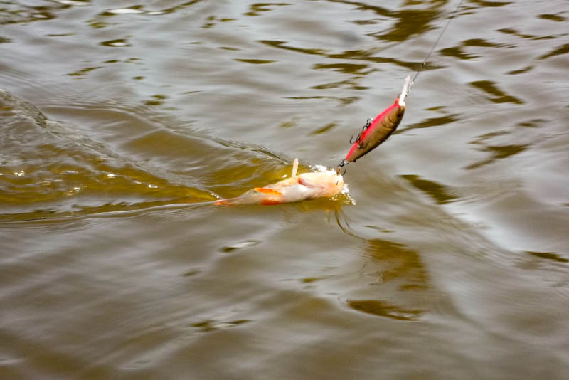 Потом рыбка позвала нас чуть помельче. Поменял клоны на 6-метровые вобики с двойной игрой. С первого прохода две практически одновременных поклевки!