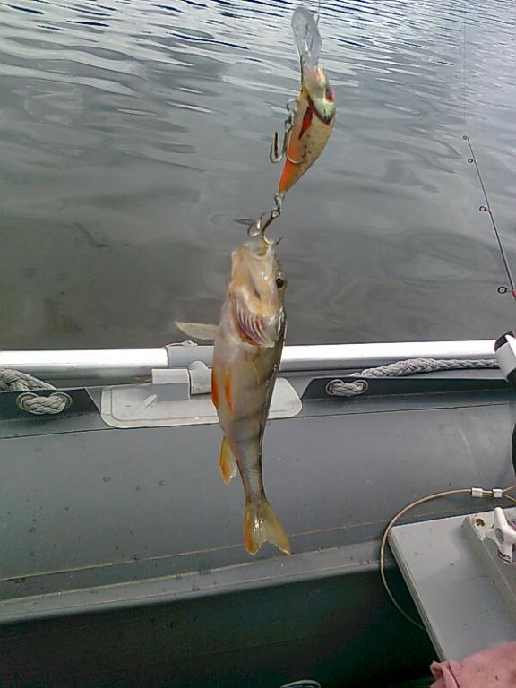 Суббота. Ф.З. Ветер с утра умеренный, к полудню раздуло до барашков и выгнал нас в шкеры... Рыба вялая - цепляется кончиком губы. Предпочитает серебристые воблеры... После обеда работал один единственный воблер (на нижнем фото), брал всё и окуня и щучку, и... даже зацепил окушка размером с него же... Подбирали второй воблер, чтоб ловил - так и не нашли в коробках ни одного... В добавок, к 16-ти пошёл дождь и эксперименты по поиску второго ловчего воблера пришлось свернуть...