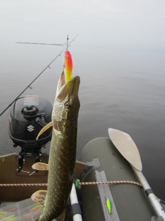 Так получилось, что в выходные опять пришлось полоскать вернюю гвардию. Сперва поехал на Залив, в р-н фортов, но судачка вообще не нашёл, зато на месте его обитания вдруг поймал двух щучек. Причём в этих местах щук я вообще никогда не ловил. Но скорее всего у меня просто не было таких чудо воблеров! :D При вчерашнем посещении озера погода была уже с периодическими прояснениями, в следствии чего иногда гонял тёмные тона. На чёрного с синим хвостиком Z-тика (см. выше) зацепил пару шнурков и подержал довольно таки мордатого крока, который заделал прикольное сальто в воздухе у лодки и плюнул в меня воблером, от такой картины я некоторое время сидел в шоке... :lol: Ну и и один из красноголовиков опять угостил котлетами... :)