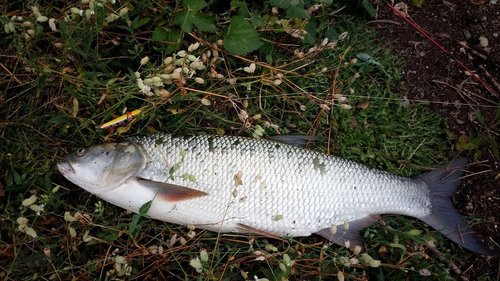 (новогодняя тематика - дочка хотела выбросить). При движении переваливается с бока на бок, идет не глубоко. Даже не понял толком чего получилось - протянул метра 2-3, и на пути воба оказался жерех 65см... Не хотел брать, но он оборвался у берега с вобом и поводком во рту. Небольшой обрывчик, а я без подсака \ бестолоч!!!\ Пришлось руками из воды вытягивать, повредил рыбу!.. Вот и пошел домой - рыбалке конец.