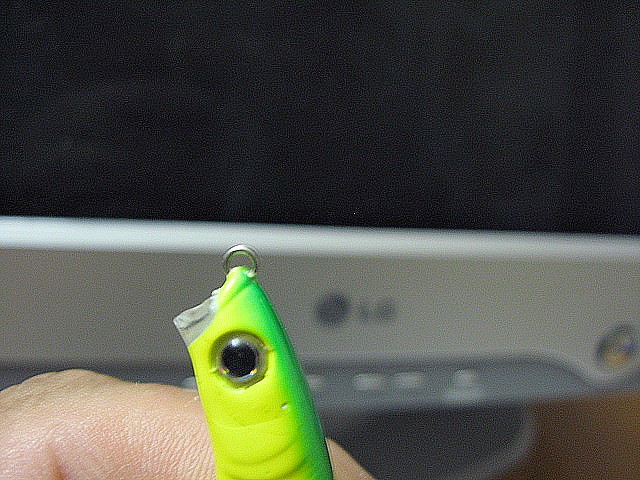 , щелкнул ее о борт и просто тупо отлетел изрядный кусок пластмассы, одна четвертая часть, что за невезуха пошла. Буду вклеивать или паять кусог пластмассы с другого, неуловистого воблера