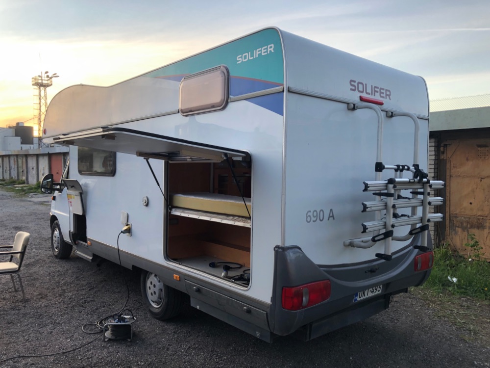 Тупо все сервисы были завалены работой и пробиться к ним было невозможно, да и не везде была возможность загнать трёх метровый кемпер. Пришлось делать самому. Ну и напоследок была заменена маркиза на новую во весь борт! Финн можно сказать обманул, сказав что она исправна. На деле мы её еле открыли, а потом замучились закрывать. Половина механизма попросту отсутствовала