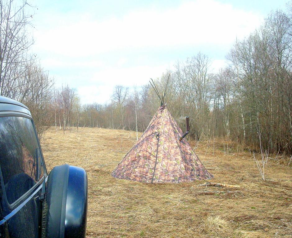 К весенней охоте, в прочем как и к любой другой, а отношусь ответственно. Однако в этом году я подошел к ней капитально. По причине смены авто, теперь в автомобиле спать не очень комфортно (зато багажник большой, можно сложить вдвое больше, чем в прошлую машину), а весенние ночи холодные, я задался вопросом теплого и комфортного ночлега на природе в прохладное весеннее время. После долгих мучений выбора временного жилища, я остановился на таком виде жилья, как чум (правда в современном варианте из палаточной ткани). Его я и заказал вместе с походной печкой у одной компании из г. Рыбинска. Данный набор я и решил протестировать на весенней охоте.