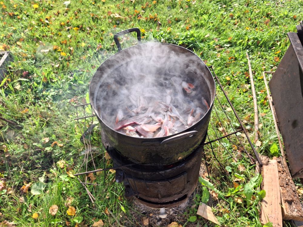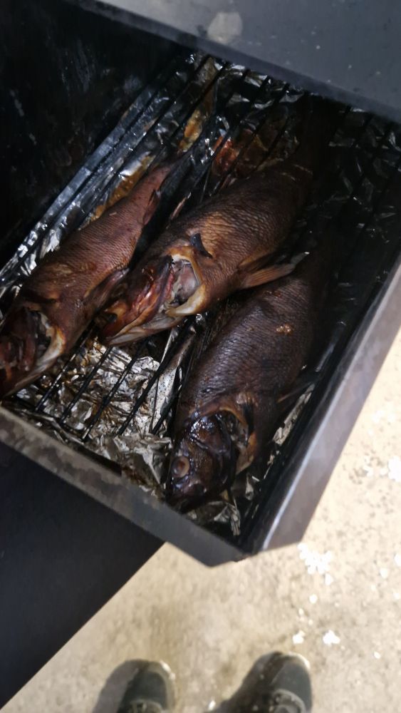 Короче 3 раза проверял, через 2.20 приготовились, забыл, что уже осень. Коптилка плохо нагревается походная, так как ветер её хорошо охлаждает не смотря на огонь под ней больше чем летом. Надо в крышку градусник вставить. Соли за 2 дня просолки рыбка взяла ровно столько, сколько надо для употребления пива. Отлично окушки залетели с пивасиком.