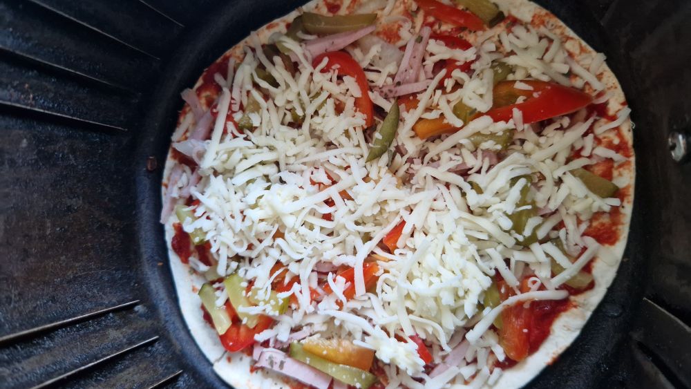 Затем, что кому нравится, удобно порезать мелкой соломкой и накидать ровномерно сверху. Маринованный огурец, ветчину, мясо колбасу, перец болгарский, лук репчатый и еще че нравится. Все присыпать тертым сыром и загрузить аккуратно в аэрофритюр, можно в сковородку (контролировать сложнее процец готовки). Время готовки 6 минут при 190 градусов и можно наслаждаться вкусом.