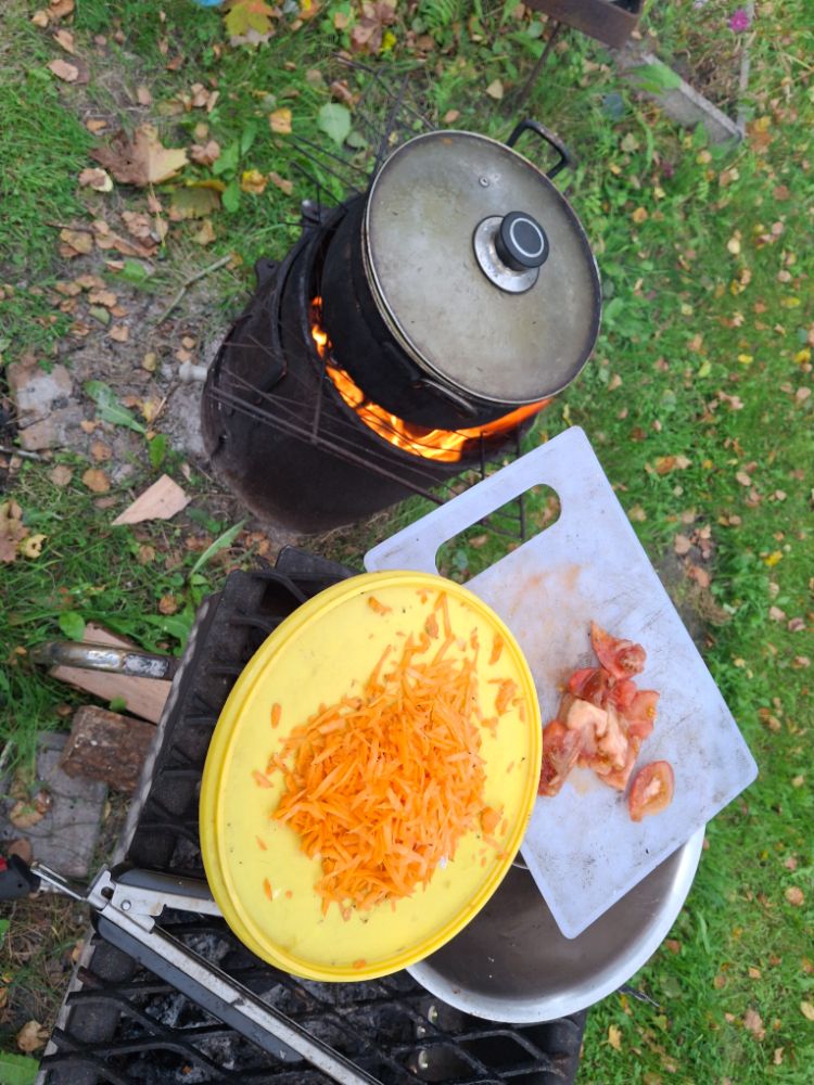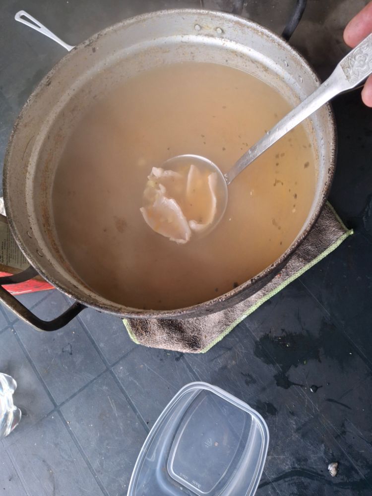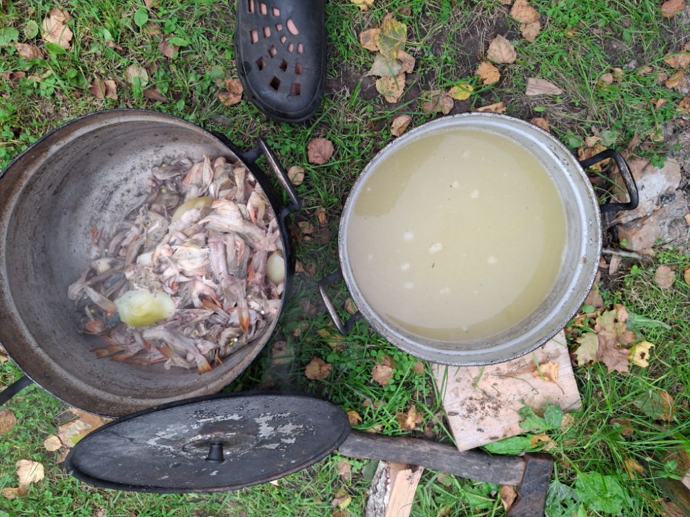 Готовый бульон , фильтруем , сливал в другую кастрюлю. И снова ставим на костёр, добавляя картошку и морковку . Ждём готовности и потом специи и всякие ништяки . Ну а потом рюмка водки холодной и приятного аппетита.