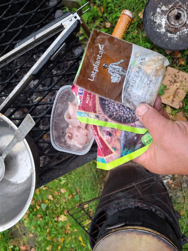 С прошлой рыбалки лень было возиться с рыбой, засыпал окуня солью на глазок, как плотву солю, а в ней был молотый лавр и ягоды можжевельника, остатки, эксперементировал с лососем. Всё в пакете оставил в гараже с вечера. В обед рыбу ополоснул, подсушил и приготовил. вкус приятный, специи аромат дали дополнительный.