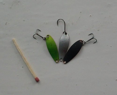 Блесна, от 2,5 до 3,5 гр. Из старого гусака для сместителя в ванной. Латунь, 1мм. (может было и толще, но скорее всего коррозия 0,5 "съела").