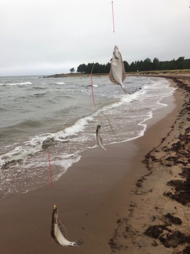 Обратный паром был взят на 8 вечера воскресенья (из-за отсутствия свободных мест на ранних рейсах). Погода радовала - солнце и сильный ветер прямо в лоб. Была надежда что камбала подошла. Но придя на берег мы сразу обнаружили много свежей травы, которую выкидывало прибойной волной - плохой знак
