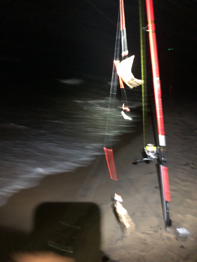 К вечеру дождь перестал, но ветер усилился. Развели мангал, приготовили ужин. К 10 часам я решил снова выйти, надеясь на вечерний выход крупняка. Но увы, пройдя почти весь пляж в ведро удалось положить лишь 2 стоящих хвоста, да и те не были гигантами по местным меркам. К полуночи лов закончил.