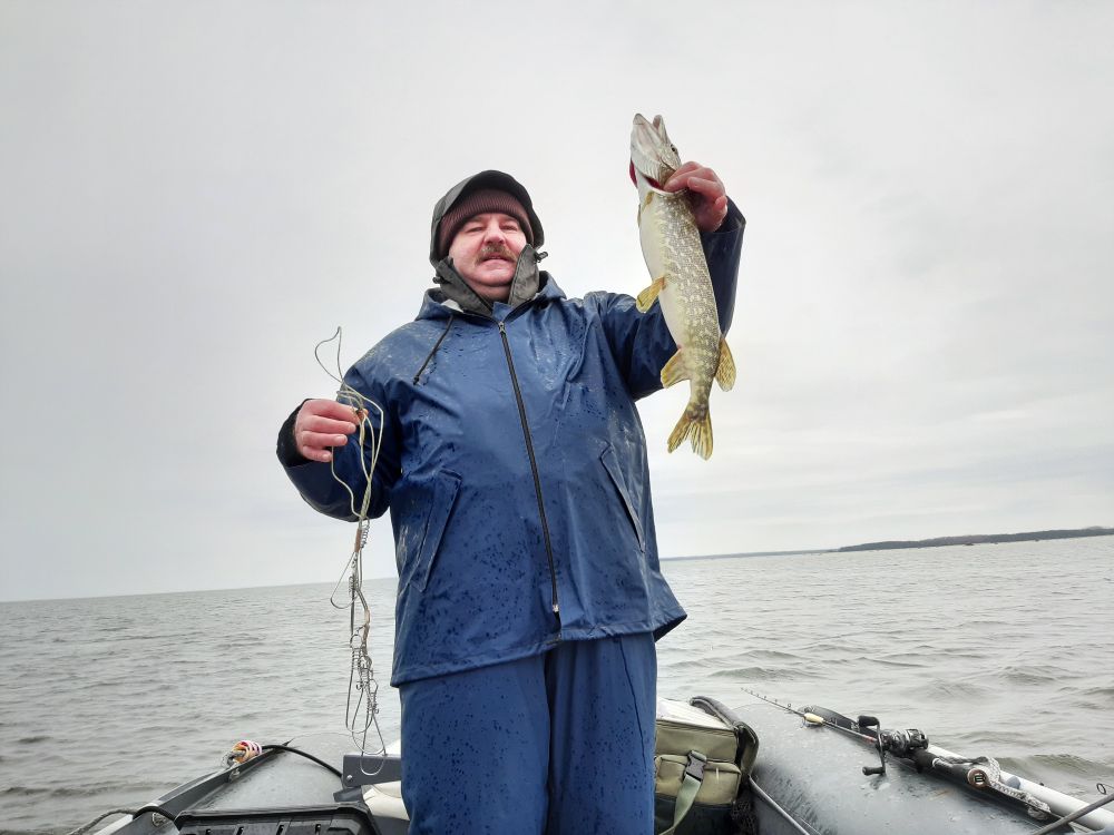 За "ветренной" щуки больше не надо, значит буду искать новые места. Пошёл на южную сторону острова. Пролез в несколько мелководных мест, а там пусто. Вода чистая, прозрачная и, без рыбы. Перебираясь с одного места на другое, тормознулся на небольшой глубине. Где то 70-90см. С первой проводки взяла небольшая щучка. Второй заброс - ещё одна сидит. Третий - и опять есть. Потом почти каждую проводку провожала рыба блесну. Взал с этого места 7 штук и решил, что хватит. Не надо мне стока рыбы. Всех щук повесил на кукан и двинулся в поиск новых мест (или стоянок рыбы). Но так больше ничего не нашёл. Были отдельные выходи, поклёвки. Несколько штук поймал с разных мест и отпустил обратно. Все пойманные были 1-1,5кг. Целый день светило солнышко. С утра было прохладно, потом потеплело. Но особенно раздеваться не хотелось. Так целый день в костюме и пробыл. Только пару раз куртку снимал. Да и то не надолго. Ветерок крутил в разные стороны, то стихал, то начинал задувать. Часика в три решил собраться домой. А на кукане 7 рыбин. На фига мне столько? Взял и поотциплял их обратно в воду. Оставил себе на гостинцы две штучки.