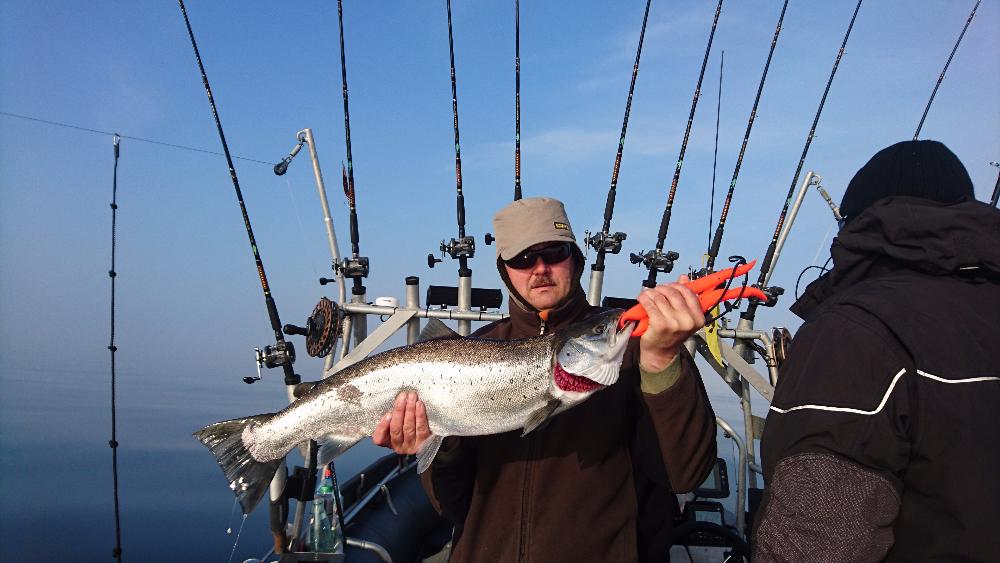Якорь не бросали, ветерок был довольно свежим и нас иногда относило от берущего долбоклюя, включали троллинг и довольно быстро находили стайку опять. Ну и настроение конечно от такой рыбалки было на пять баллов!