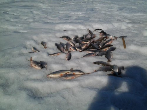 Мелочи отпустил десятка два, домой забрал 39 штук, толстых красивых плотвиц. Удочка убегала пару раз в лунку, также было два обрыва мормых (жалкоооооо, больше нет таких, золотой крупный банан) Всё на червя, причём если менял на свежего - поклёвки были просто зверскими. Очень понравился день, рыбка порадовала и активностью и размером. Окушки попались штуки четыре, но очень мелкие, детсад. Глубина ловли - два метра максимум, брало со дна практически. При вываживании в лунке сначала появлялась муть, потом рыба, прилично сопротивляющаяся. Кайфанул.