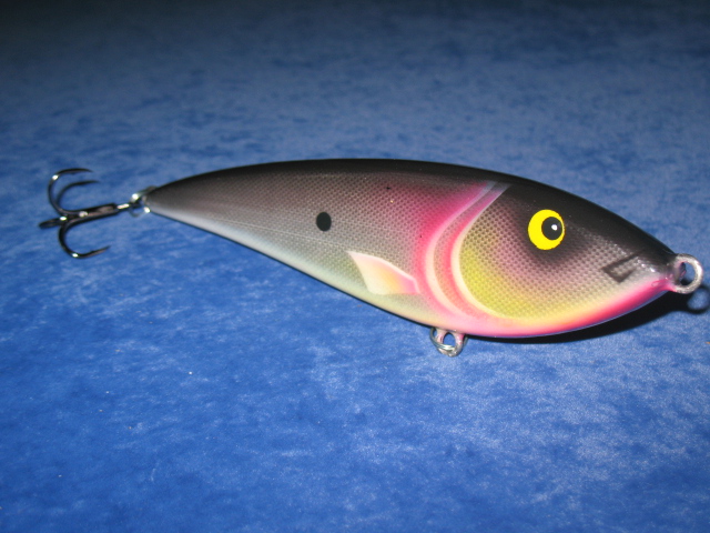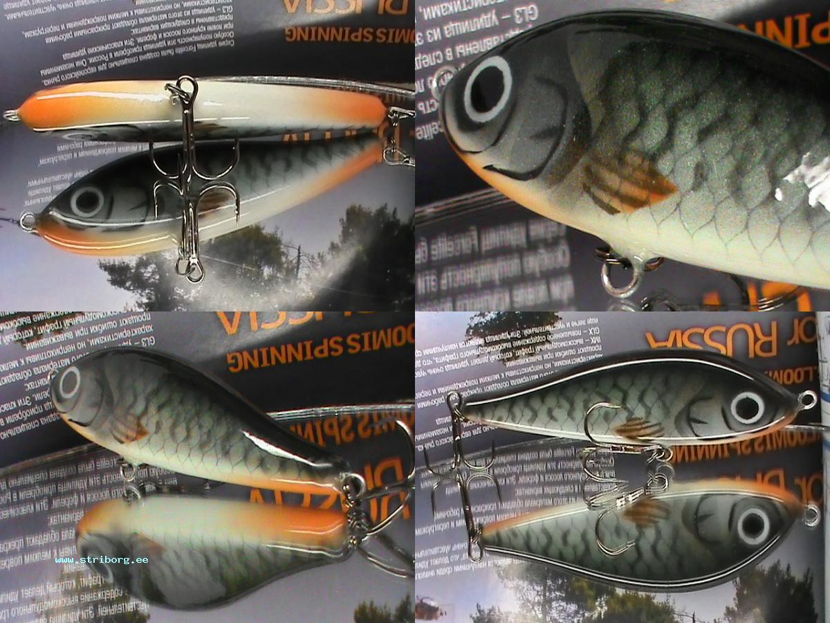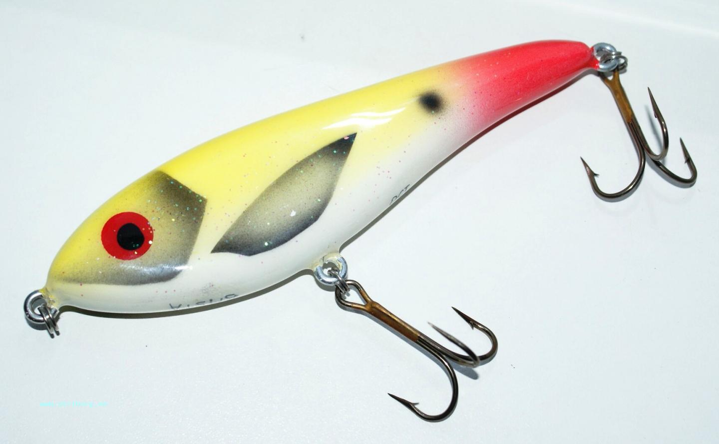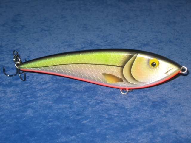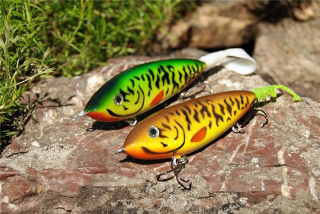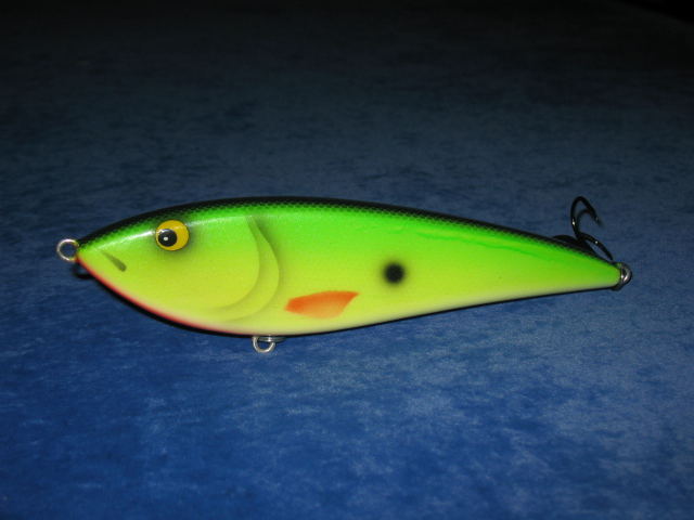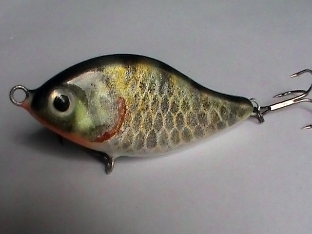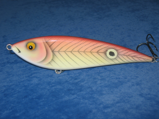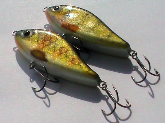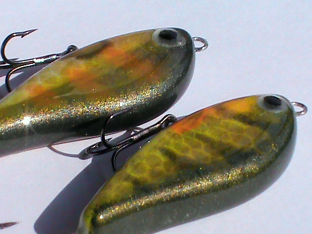 Посмотри на покрытие аналогом Энвиротекса, который по сути, является эпоксидным клеем холодного отверждения, с добавкой 5 - 15 % нонилфенола. Задачи нанесения тонкого покрытия никогда не стоит.Это легко достигается разбавлением лака, растворителем. А важно нанести максимальное количество лака, за 1 или 2 операции, без наплывов и внутренних напряжений. И если после покраски джерка, не трогать его руками,а пользоваться перчатками, то никаких "проплешин и ямок" не будет. На эти медленно тонущие джерки 135 мм /40 г, за 1 операцию,кисточкой наносится 2 г лака, т.е. 5 % от веса. Возможно, фото не передает глубины, а они как мухи в стеклеIkel писал(а):можно что-нибудь глянуть покрытое Энвиротексом? И ещё пару вопросов в догонку по нему же: если слой Энвиротекса получается тонковатым, "проплешины" или "ямки" получаются? Получается, что для каждого воблера надо экспериментально подбирать количество Энвиротекса? Каким инструментом осуществляется покрывание воблера?
