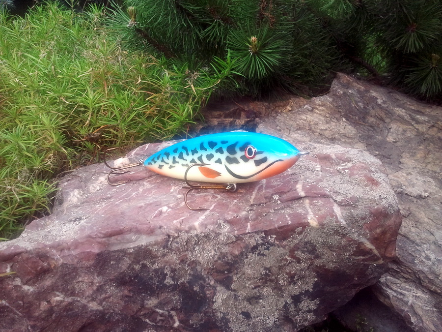 Сделал три джерка (мини или микро не знаю) размер 98 мм, вес если магазинные весы не врут 20 гр, тонут со средней скоростью при этом качаясь из стороны в сторону.Материал липа. Цель была сделать размер больше чем те которые делал до этого, причина в том что на маленькие выскакивают совсем мелкие щучки. Еще одна цель которой хотел добиться это при таких размерах чтобы были тонущие и имели не очень большой вес, так как спиннинг у меня до тридцати грам, это удалось добиться за счет не толстого тела (толщина в итоге получилась 11 мм).Как уже писал неудачно получилось покрытие, краска потрескалась и все металики получились блеклые,а на синем перемудрил с плавниками.