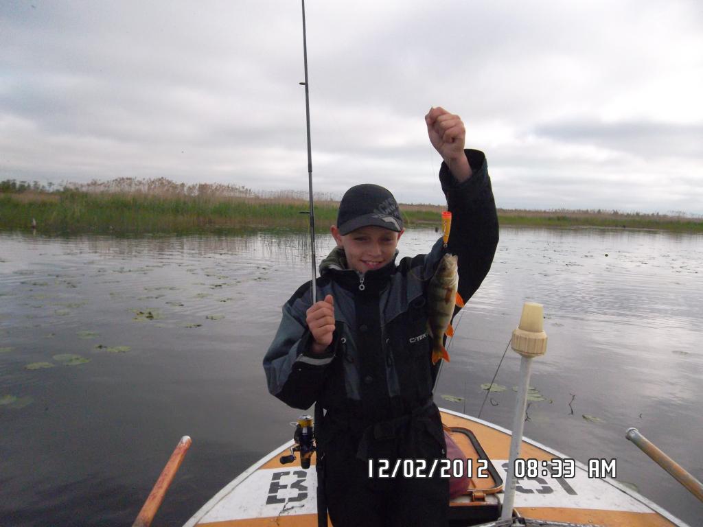 ..с утра прокатились по руслу, активность была не высокая, но была полторашка и в 0,8 в ящик.. ..доехали до Киргисоо, покидали с краю по канаве1,5-1,8м, ни поклёвки.. ..пошли по бровке, ещё 1,5кг и шнурки.. съехали в заводь, сынка-Вовка, на поппер, вылущил окуня.. .. потом полтора часа безрезультатно полоскали железки, одного шнурка чуть не в размер уговорил таки, отпустил за бабкой, обещал привести, обманул стервец