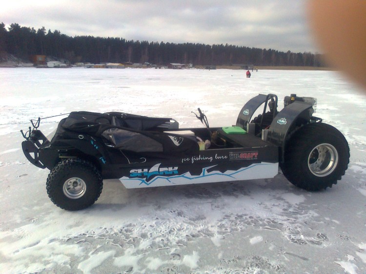 Олег, сия хреновина стоит дорого. Цену знаю, но боюсь озвучивать. Народ это может принять за номер телефона и начнётся неразбериха со звонками в неизвесность!:D На технике стоит гидравлика, т. е. она опускается для ловли и поднимается для передвижения. В днище есть отверстия для бурения лунок с дальнейшим их использованием по назначению. Есть тент на всю длину базы и да, она плавает, ну или не тонет, как тебе благозвучней. Хотя как первое, так и второе у меня ассоциируется с унылым гуано! На лёд залазит благодаря шинам низкого давления. Двигло 1.2 кобылы (кажись), а может и меньше, как у пылесоса или швейной машинки, но видимо большего и не надо....