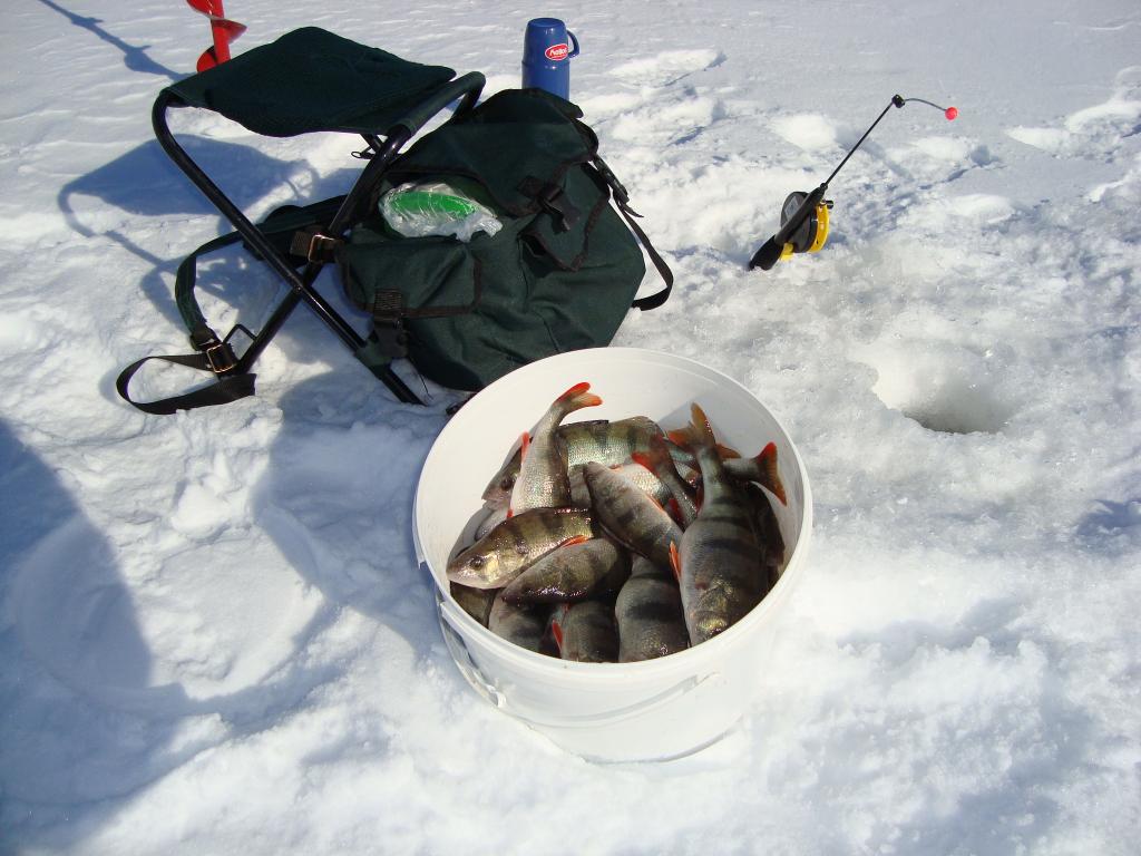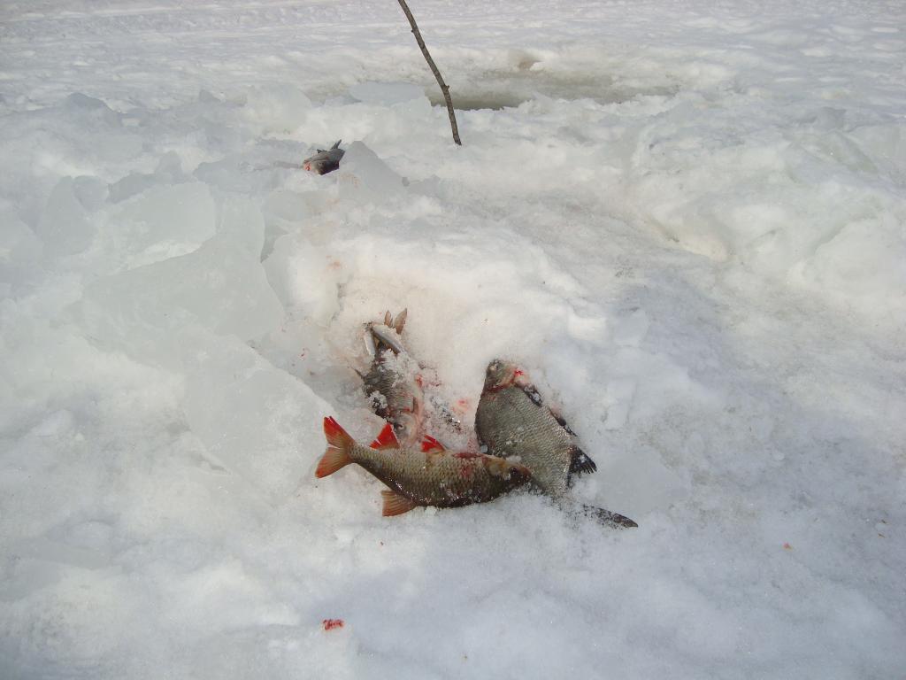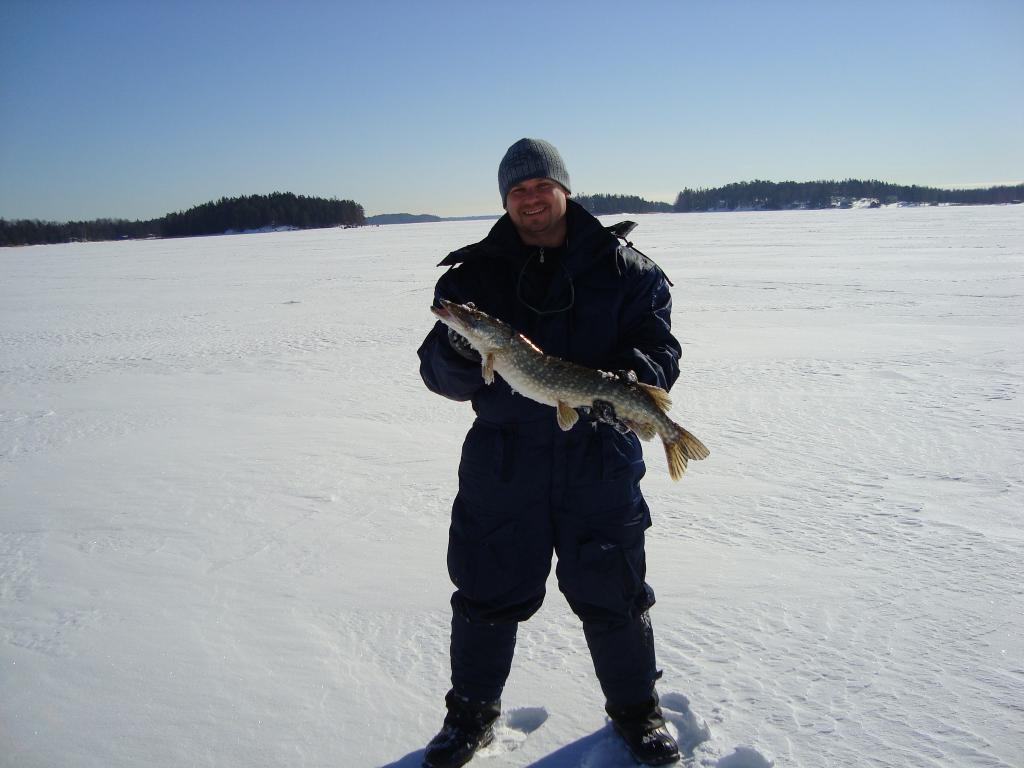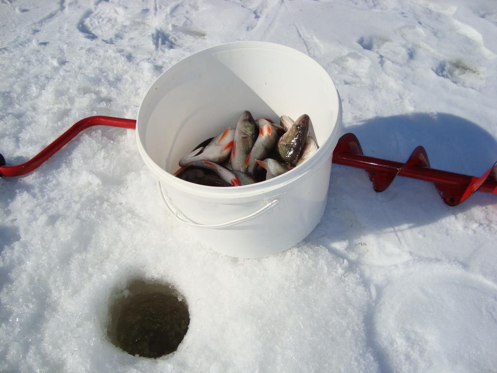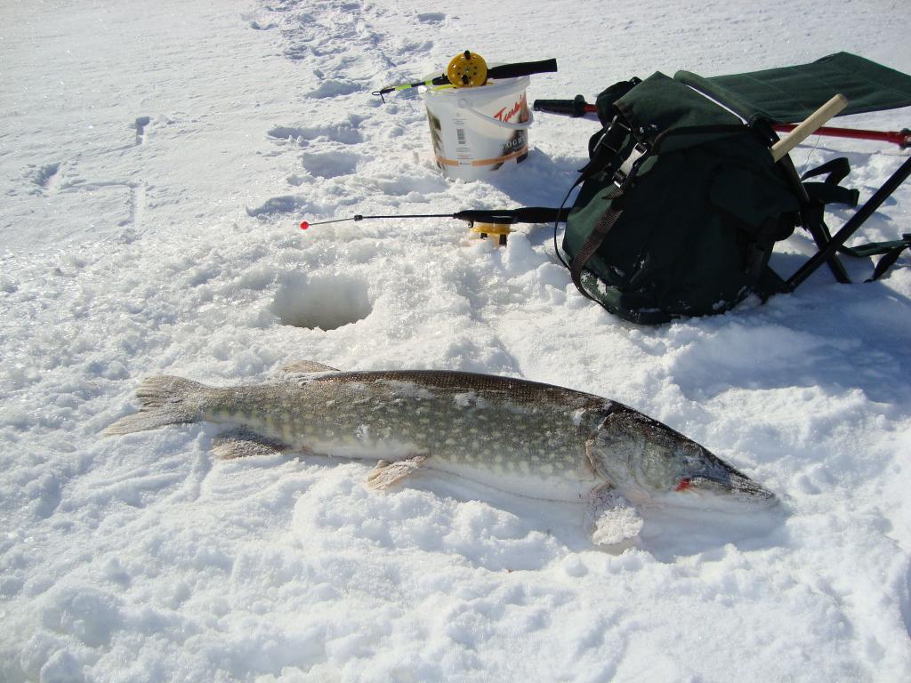 Сегодняшний выход на залив увенчался победой , в виде выловленной щуки на 3.5 кг. Пришлось повозиться с выуживанием на лёд сего экземпляра . Ни как не хотела свою морду засунуть в лунку , встала поперёк и всё . Вывод : под рукой должен быть багорик . Окуня было сегодня мало , около 1.5 кг. А день какой сказочный был : солнышко светит , тепло , на душе спокойно и уютно . Много было парашутистов с моторчиками за спиной . А некоторых на АТВ поднимали , причём очень быстро это происходит . Рыбочки поблизости были , но особой активности не наблюдал . Завтра собираюсь на новое место
