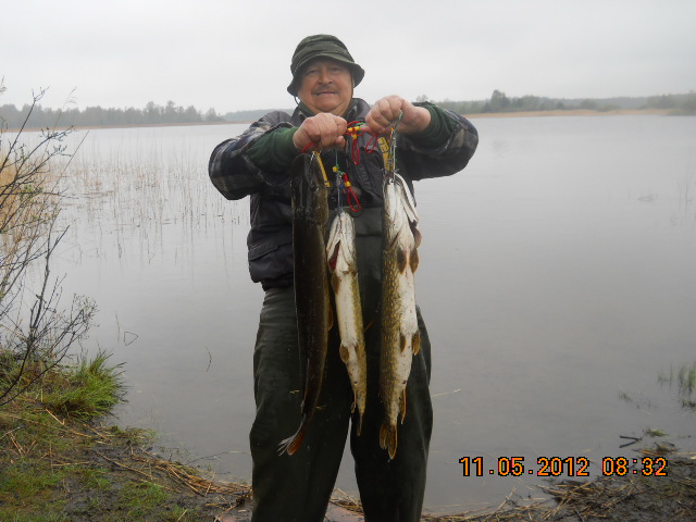 нашел практически сразу-поймал 4шт и все отпустил,всетаки искал стоянку крупной....К 7 утра нашел где она пасется...И тут пошел дождь,не просто дождь,ливень...Куртку с гортекса пробило буквально через 10мин.И в этот ливень случился выход крупной щуки.Поймал 4шт,пару сошло.....Так как промок уже изрядно,да и выполнение нормы вылова было налицо-пошли домой. По дороге одна резвая щучка сумела освободиться и ушла с кукана....У Игоря,на черных камнях, 1 щука,у меня 3, самая большая-3,6кг,остальные поменьше.
