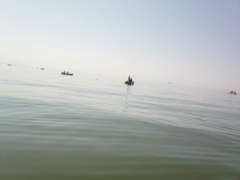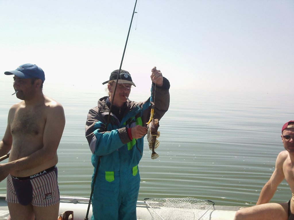 Прибыли, хотя какие там прибыли, растраты одни. А на море полнейший штиль, даже прибоя нет. Солнце уже печёт, хотя ещё довольно раннее утро. Скинулись и не беря ничего лишнего отчалили за одноусой. Повтор захода на кочки с единичными лодками вновь принёс больше проблем чем рыбы. Литовские рыбалеи вновь оказались на высоте по манере и скорости обрубания. Время идёт а хвастаться пока нечем. Звоним второму экипажу и узнаём, что они уже третье ведро распечатали и продолжают косить рыбаса с завидным постоянством. Плывём к ним. Какое сегодня наслаждение сидеть на бортовом балоне и не беспокоиться за задницу и зубы. Пришлось слегка подраздеться из за жары. Васин панцырь на лице и шее принял цвет хорошо проваренного рака. Не будь у меня с собой зажигалки, прикуривал бы от него. Подошли к сотоварищам. Они только встали на якорь, банку для намотки верёвки до этого использовали для ориентации как буй а ловили сплавом. Показали улов, ну что тут скажешь, обошли нас по полной. Придёться навёрстывать. Постояли, потрындели и приступили к ловле.