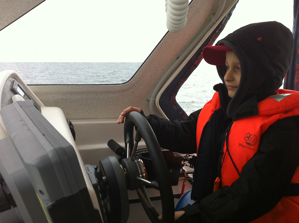В это время судорожно забился кончик доунриггерной палки, подсекаем и первая пятнистая одноусая рыба на борту. Ура, вот она какая... литоффская треска. Взвешивание показало около 2 кг. Неплохо. Идём в режиме безделья ещё какое то время, до скопления лодок. Показания эхолота рисуют интересный рельеф, тормозимся и якоримся. И тут пошло веселье... Лёгким джигом, как пилькером, покачивая с небольшой амплитудой, вынимаем с 20 метров пятнистых рыбов. Ребёнок ловит первую, вторую и тут же третью. Папа, я юнга? Да, сын, ты юнга... тока отстань, дай половить. СергейС ловит, Саша ловит, а я смотрю... не вешается никто на мою приманку, хоть тресни. Перемещаемся на другое место, клюёт плохо и мелочь... После созвона с латышскими коллегами, забиваем фартовую точку и направляемся в сторону Клайпеды. По навигатору 27 км, скорость 50, за штурвалом, с довольной физиономией, юнга. Горящие глаза говорят, что рыбалка уже получилась и добыча рыбы уже не так важна.