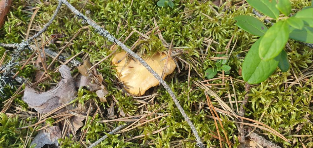 На Вильяндском шоссе их меньше, но тоже растут, родственник по моим местам за 2 часа набрал 15 литров. А это тоже съедобный гриб, на фото ниже, лисичка воронковая, я их не собираю, но слышал суп из них вкусный.