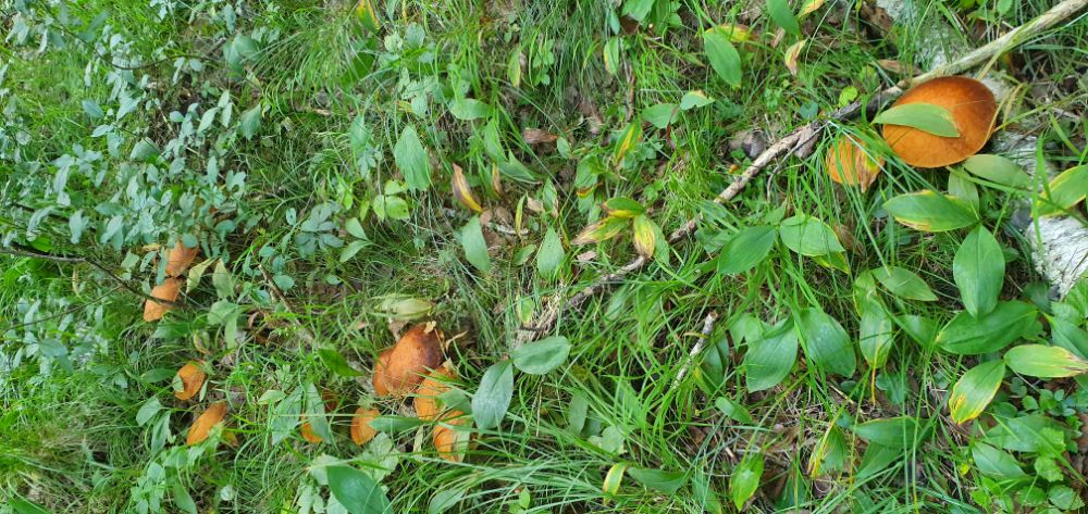 Парковка вся истоптана, в лес идёт чёткая тропа, вхожу, через 5 метров в траве стоят молоденькие красавцы... Много переростков, просто стоят стаями бери не хочу, много червивых и молодых, все крепенькие, просто кайф, душу отвёл. Да такого изобилия я здесь давно не видел, видать пришёл цикл урожайности подосиновиков, место болотистое, но в этом году тоже сухое, воды нет, в траве высокой больше старых грибов, а в высохших лужах только только молодые лезут.
