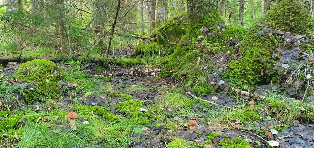 Обещали ветер 5 метров, а вокруг штиль. Ночной дождь прибил к веткам лосиных мух и они не надоедали, утро холодное, лес мокрый, на небе редкие облачка и солнце, просто манго для сбора грибов.