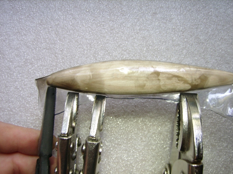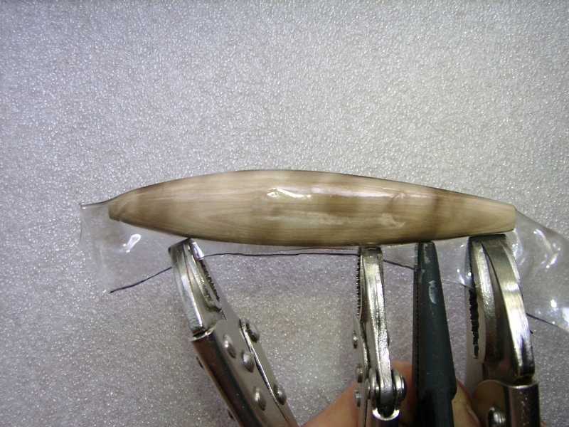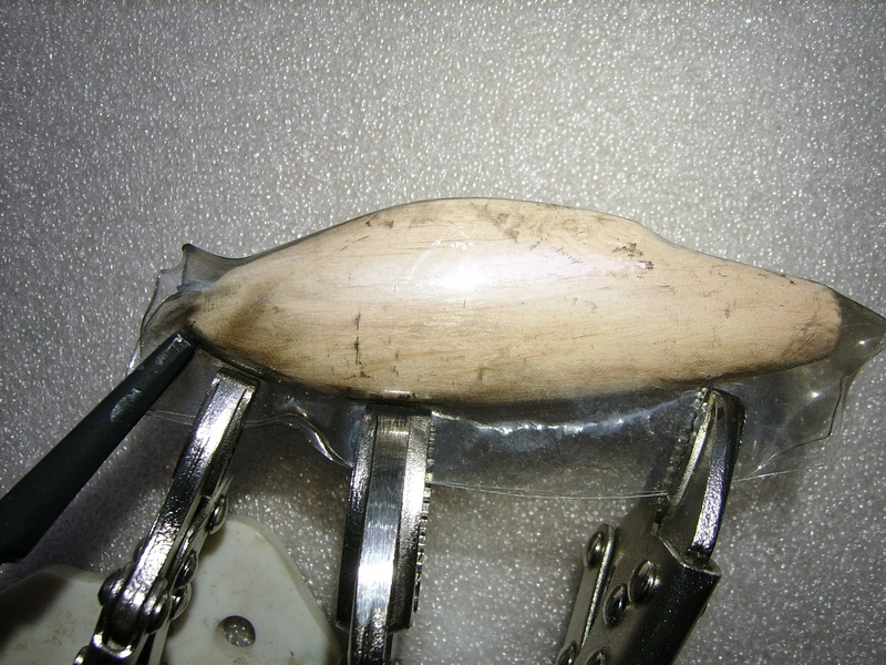 Вот так делаю панцири из ПЭТ: оборачиваю заготовку (не из мягкой древесины!), фиксирую зажимами (ручные тиски, раньше такие назывались -зубр). С удовольствием использовал бы что-то покомпактней зубров, но не придумал пока ничего. Разве что, наделать самому мини-стубцины размера этак 1/2 дюйма. Усилие зажима должно быть приличным, крокодильчики не канают...