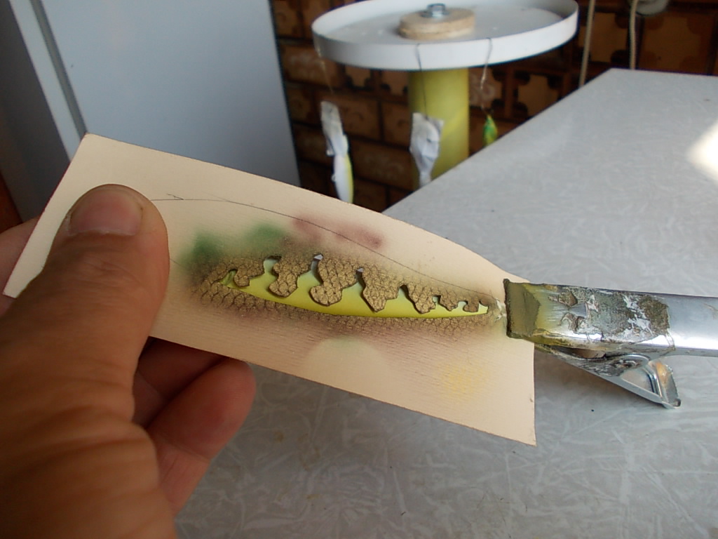 Из бумаги хуже,сложнее работать, не видно что под трафаретом, да и помыть его нельзя, но наскорую руку работать можно.... С прозрачным проще , видно под ним и легче центровать, одна часть трафарета центруется и крепится за петлю, вторая центруется по воблеру , пшикаем одну сторону, сразу же вытираем трафарет ветошью, и переставляим зеркально на другую сторону, вот и весь фокус , без всяких зажимов.... Ну а различные произвольные пятна , точки .... вообще можно делать без трафарета ( кстати твоя лохматая кисточка ,как нельзя лучше подходит к этому) Да и Андрюха, хватит экспериментов, давай за работу, ты и так много уже знаешь