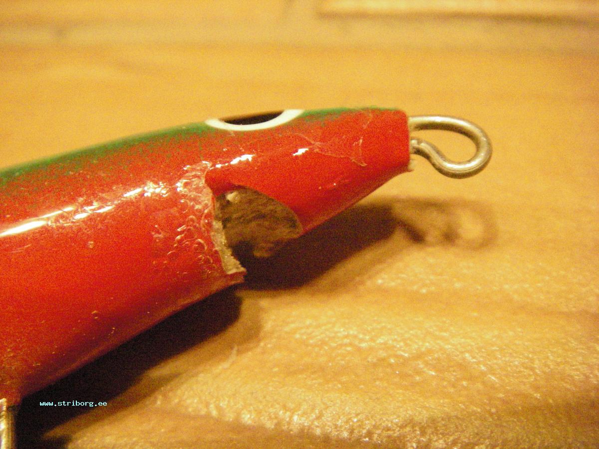 Олегыч наверно ты прав. Но главное я считаю то, что эти воблеры делаются из легких материалов(бальза и ППУ), а любое внедрение в тело воблера меняет развесовку и соответственно игру. А щука поймана на другой воблер, с Z-лопастью. Мне нравится что мои воблеры радуют рыбаков, а лопасти - ну что делать, бывает и такое.Дык, что тут смотреть. Очевидно, что счук схватил воба с головы и исплользовал лопасть как рычаг для взлома. Надо-бы продумать и изначально внедрять какую-то облегчённую шину жёсткости в пропил данного места.На самом деле у воблеров с "седлом" это очень слабое место, особенно при применении древесины с малым удельным весом и плотностью.