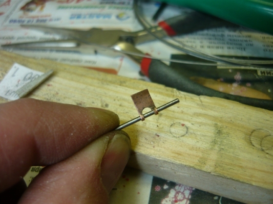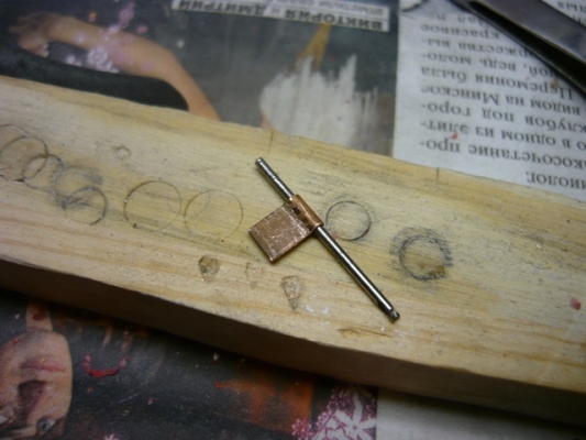 Второй способ чуть сложнее. Отрезаем полоску металла, например - 4 мм. Если под ось вертушки будет использоваться проволока 0.6 мм. , то берём проволоку или свёрлышко потолще ( 0.8 - 1.0 мм.)