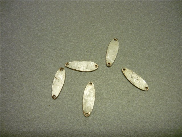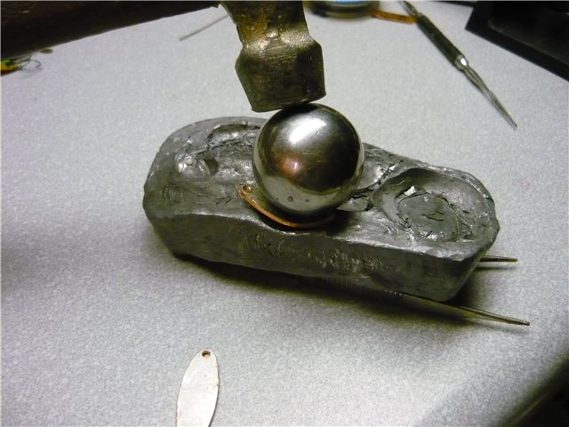 Под лесочные усы делаем два отверстия. Положив заготовку на деревянный брусок прокручиваем шилом отверстия так, чтобы леска плотно проходила. Почему шилом? Шило имеет коническую форму и отверстие соответственно получится коническим. Та сторона блесны с которой расположено основание конуса впоследствии будет наружной, потом скажу, почему. В отштампованных и протестированных в ванной блёсенках размечаем отверстие под одинарный крючок. Сверлим отверстие по диаметру заклёпки (медная проволока) и зенкуем с наружной стороны под шляпку заклёпки. На данном этапе, если нужно, можно блёсенки отполировать. Вставляем в отверстие заклёпку, надеваем на крючок бусинку , устанавливаем на место и приклёпываем. Заклёпку зашлифовываем и полируем.